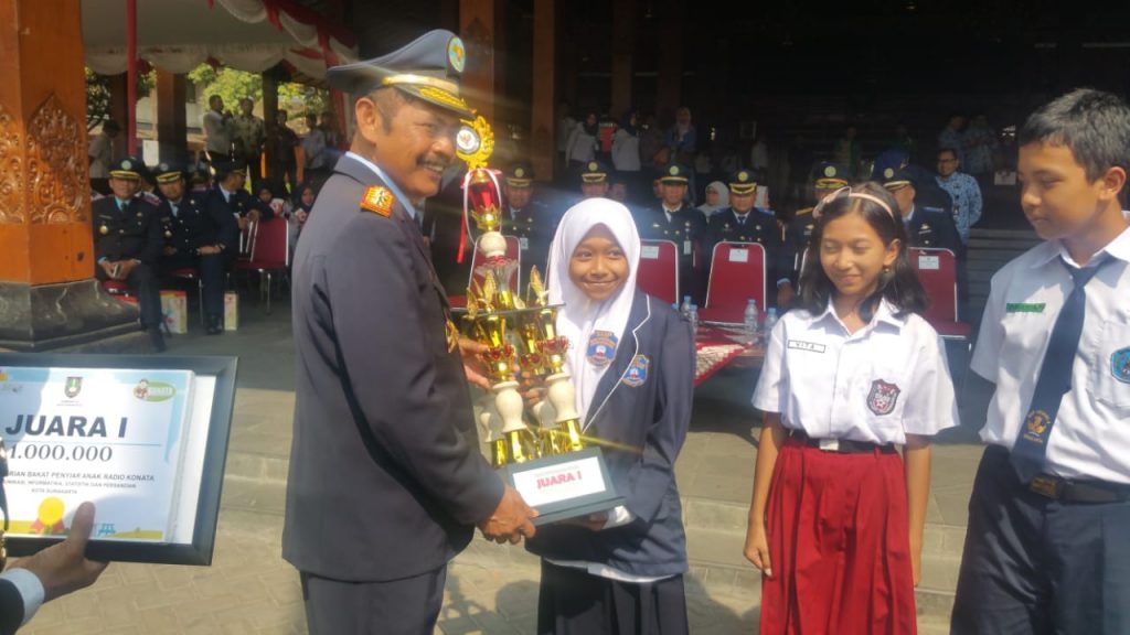Wali Kota Surakarta, FX Hadi Rudyatmo menyerahkan piala juara pertama lomba pencarian bakat penyiar anak kepada Nabiila Alya Hernanda, siswi kelas 7 SMP Muhammadiyah PK Kottabarat Surakarta pada Selasa (17/9) saat Upacara pagi di Balai Kota Surakarta.