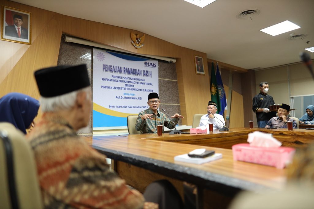 Ketua Umum PP Muhammadiyah, Prof. Haedar Nashir saat memberikan tausiyah di hadapan para pimpinan UMS, PP Muhammadiyah dan Pimpinan Wilayah Muhammadiyah Jawa Tengah, Senin (1/4/2024). (Humas UMS).
