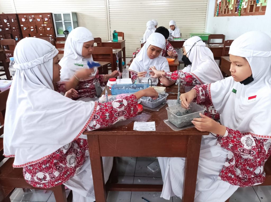 “Kurikulum Merdeka menekankan siswa dituntut aktif tergerak, bergerak dan menggerakkan dengan arahan dari bimbingan guru. Dalam hal ini Ibu Annida Lathifa Riandy Putri,” ujarnya. Annida Lathifa Riandy Putri, salah satu guru kelas VI, menceritakan proses pembuatan patung diawali dari pembuatan bubur kertas dan kerangka tubuh disiapkan dari rumah.
