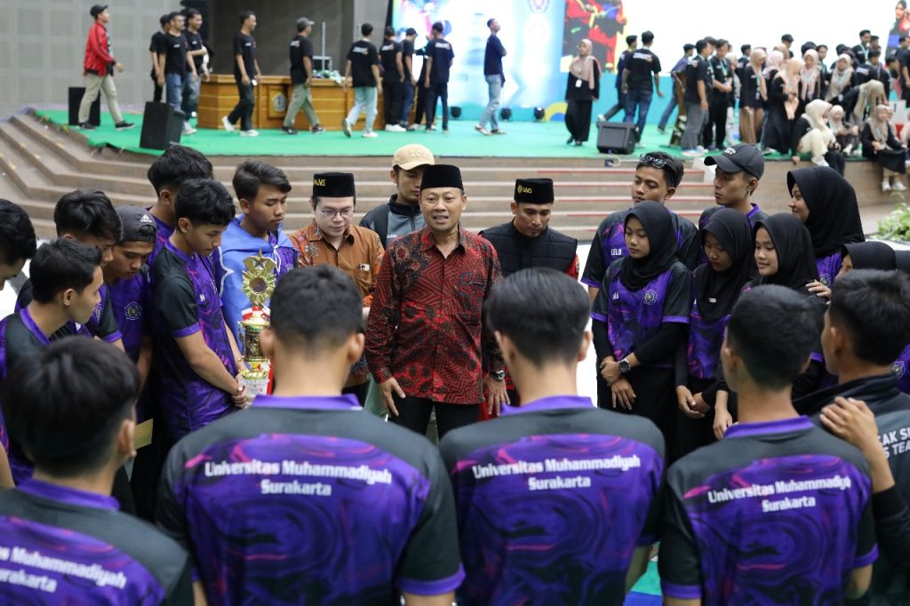 Wakil Rektor III UMS, Prof. Ihwan Susila (berbatik merah), saat mengapresiasi tim Tapak Suci UMS yang menyabet gelar juara umum kategori dewasa. (Humas).