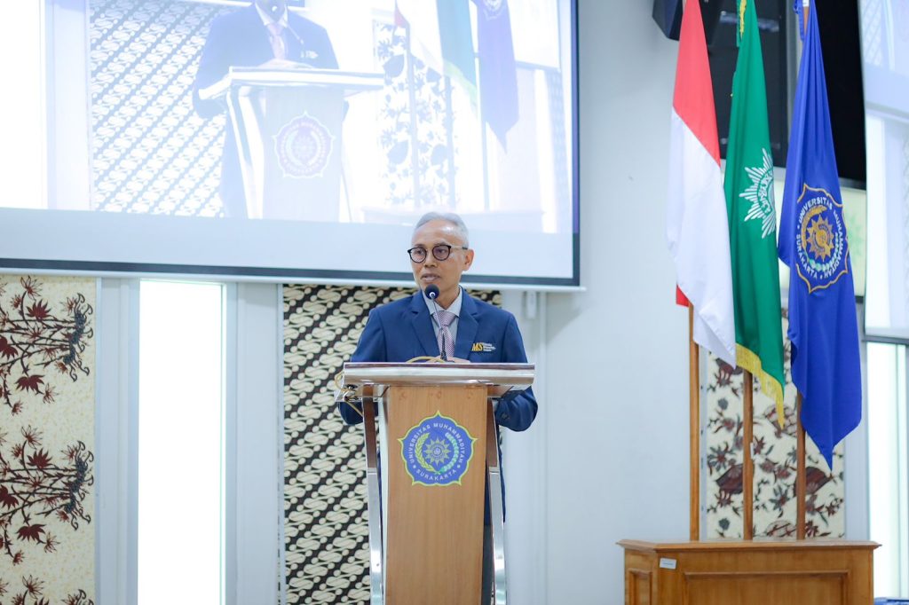 Rektor UMS, Prof. Harun Joko Prayitno, saat menyampaikan welcoming speech pada acara peluncuran buku Kiai Marpuji Ali. (Humas).