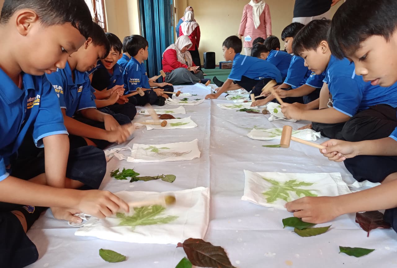 Siswa putera SD Muhammadiyah PK Kottabarat tengah asyik membuat produk ecoprint. [Humas].