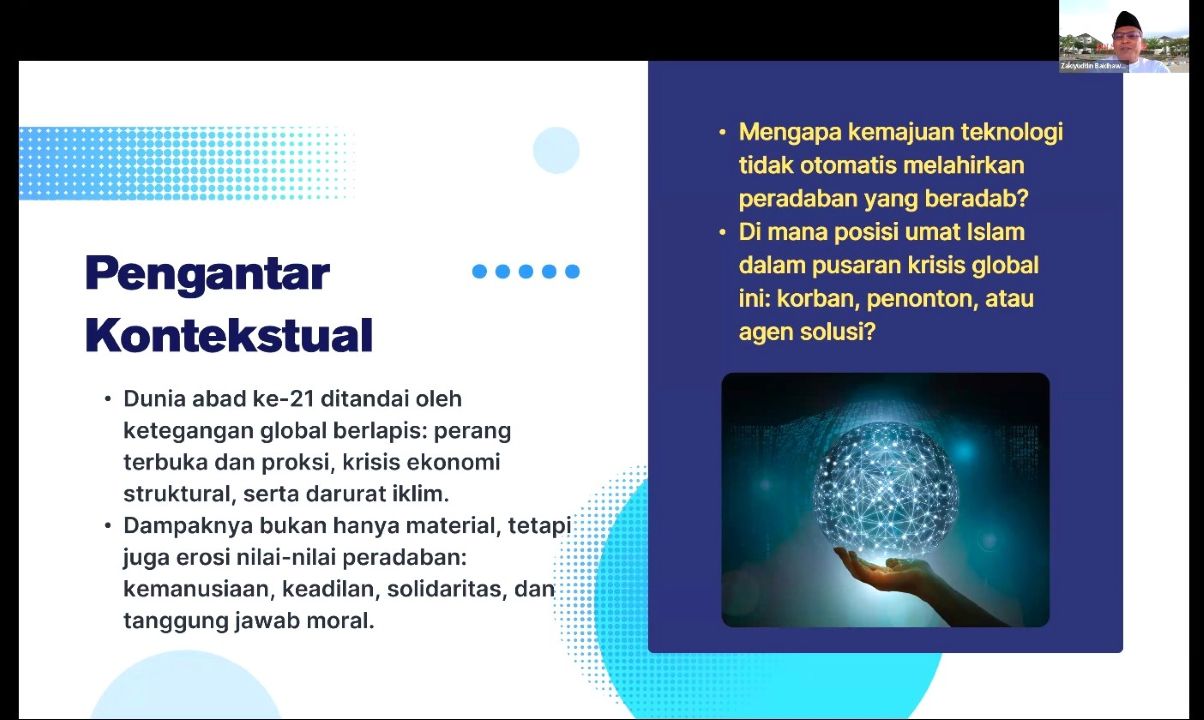 Webinar Series ke-56 ini, lanjutnya, menjadi ruang refleksi kritis sekaligus ajakan moral bagi sivitas akademika dan masyarakat luas untuk meneguhkan kembali nilai tauhid, kemanusiaan, dan keberlanjutan sebagai fondasi membangun masa depan global yang lebih adil dan berimbang.