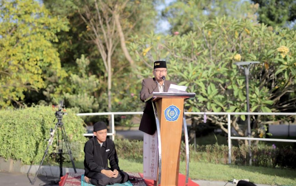 Ustaz Yayuli saat menyampaikan khotbah Idulfitri di halaman Edutorium UMS, Jumat (20/3/2026). [Humas].